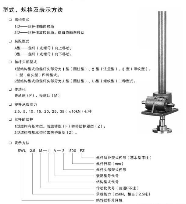 概述 SWL系列蝸輪絲桿升降機又稱QWL升降機以及螺旋升降機廣泛應用于機械、冶金、建筑、水利設備等行業(yè),具有起升、下降及借助輔件推進、翻轉及各種高度位置調整等諸多功能.SWL蝸輪絲桿升降機是一種基礎起重部件,具有結構緊湊、體積小、重量輕、動力源廣泛、無噪音、安裝方便、使用靈活、功能多、配套形式多、可靠性高、使用壽命長等許多優(yōu)點。可以單臺或組合使用,能按一定程序準確地控制調整提升或推進的高度,可以用電動機或 其他動力直接帶動,也可以手動。它有不同的結構形式和裝配形式,且提升高度可按用戶的要求定制。 。該裝置可以自鎖