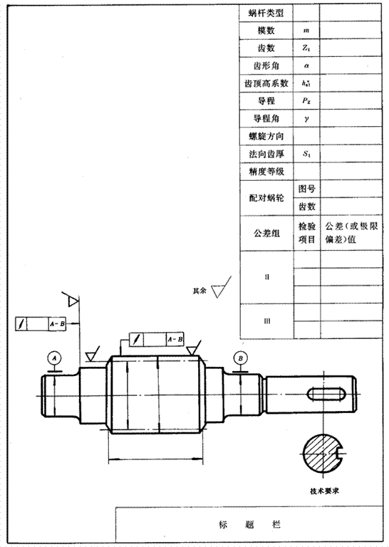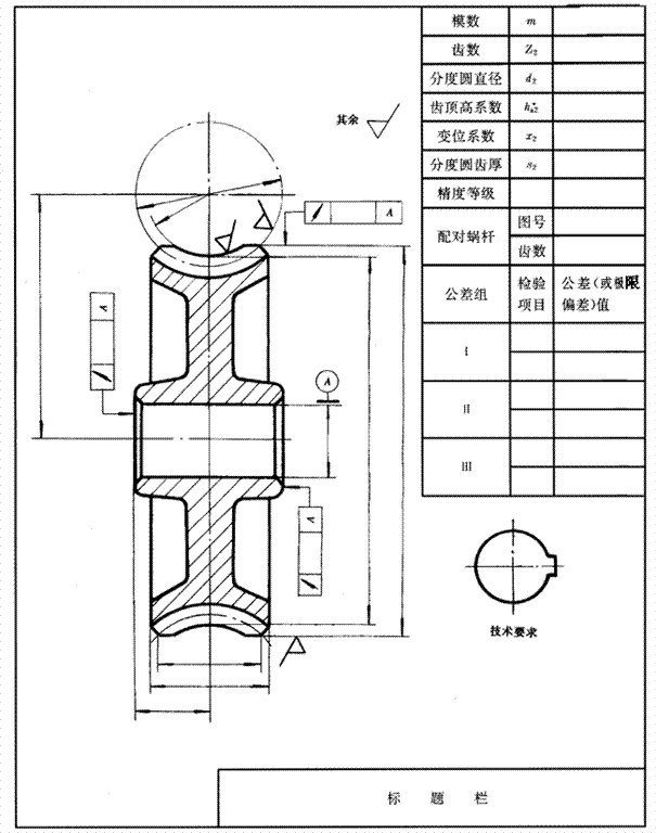 蝸桿、蝸輪圖樣的繪制應(yīng)符合GB4459.2的規(guī)定。圖樣中的參數(shù)表一般放置于圖面的右上方,參數(shù)表中列出的數(shù)據(jù)項(xiàng)目可根據(jù)需要增減,檢驗(yàn)項(xiàng)目則按使用要求和用戶意見根據(jù)GB10089和有關(guān)標(biāo)準(zhǔn)的規(guī)定確定。圖樣的技術(shù)要求一般放置于圖面的右下方。